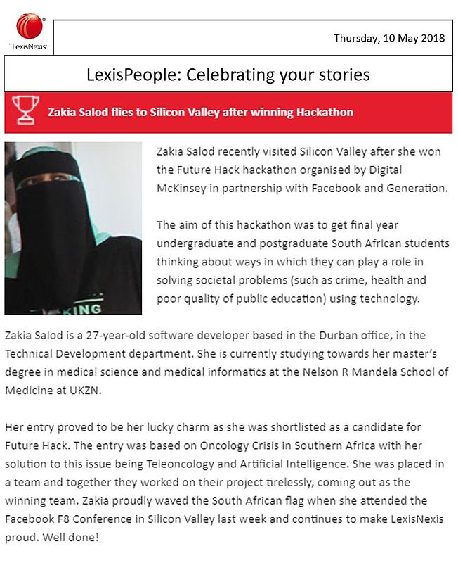 - I was featured in the 'LexisPeople: Celebrating your stories' LexisNexis news of South Africa (I was working at LexisNexis South Africa at the time, but the hackathon was my personal initiative): please see my feature below: